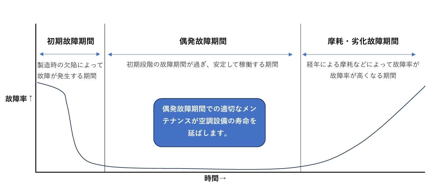 初期故障期間を過ぎた後、偶発故障期間に発生する故障の確率は、予防保全の有無によって変わり、空調設備の寿命も大きく左右されます。(上の図参照)